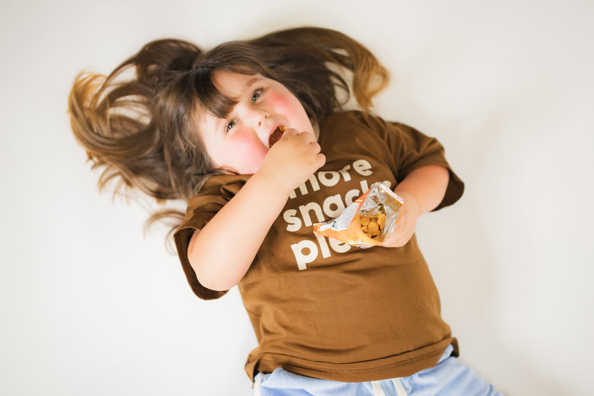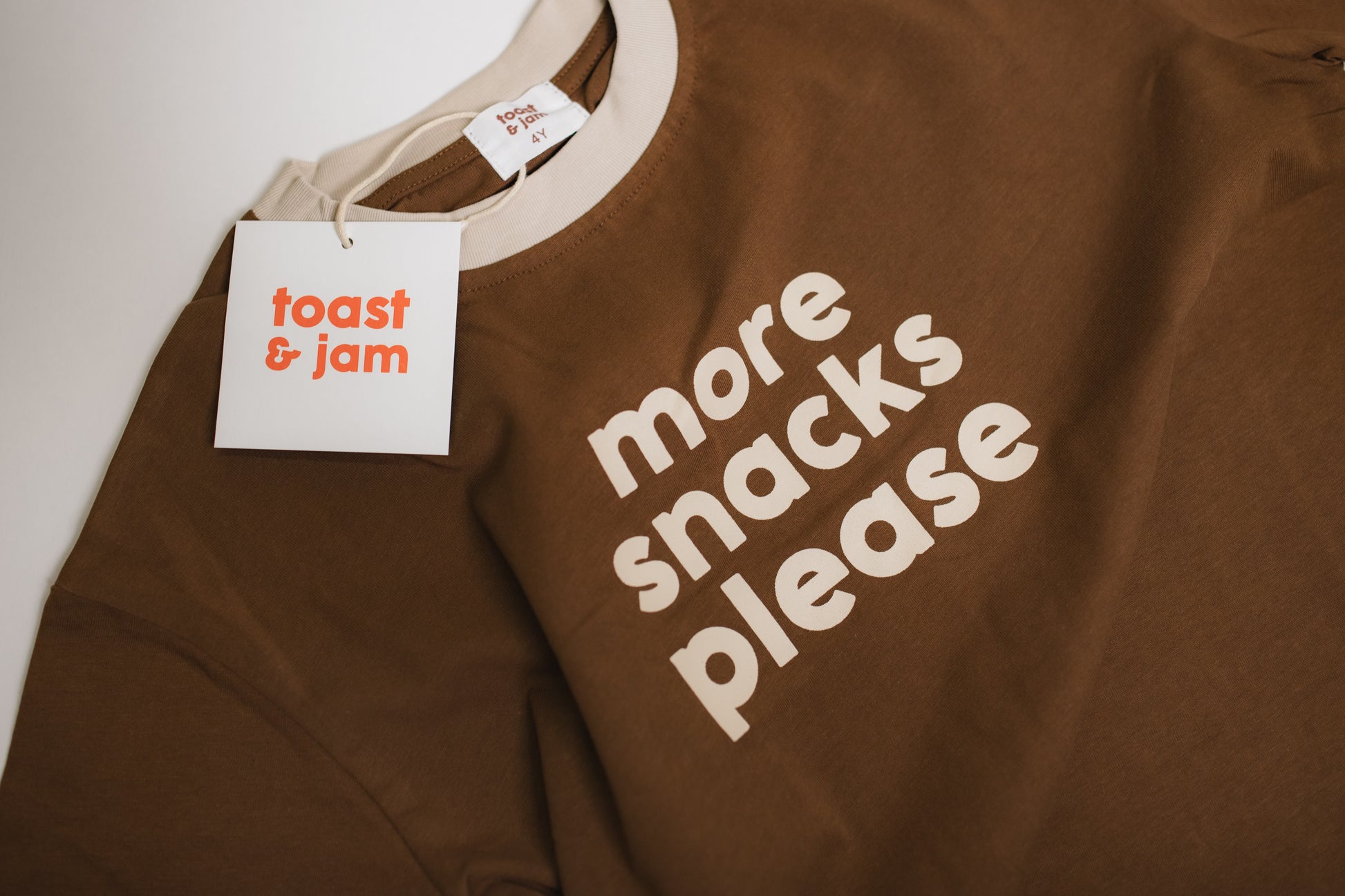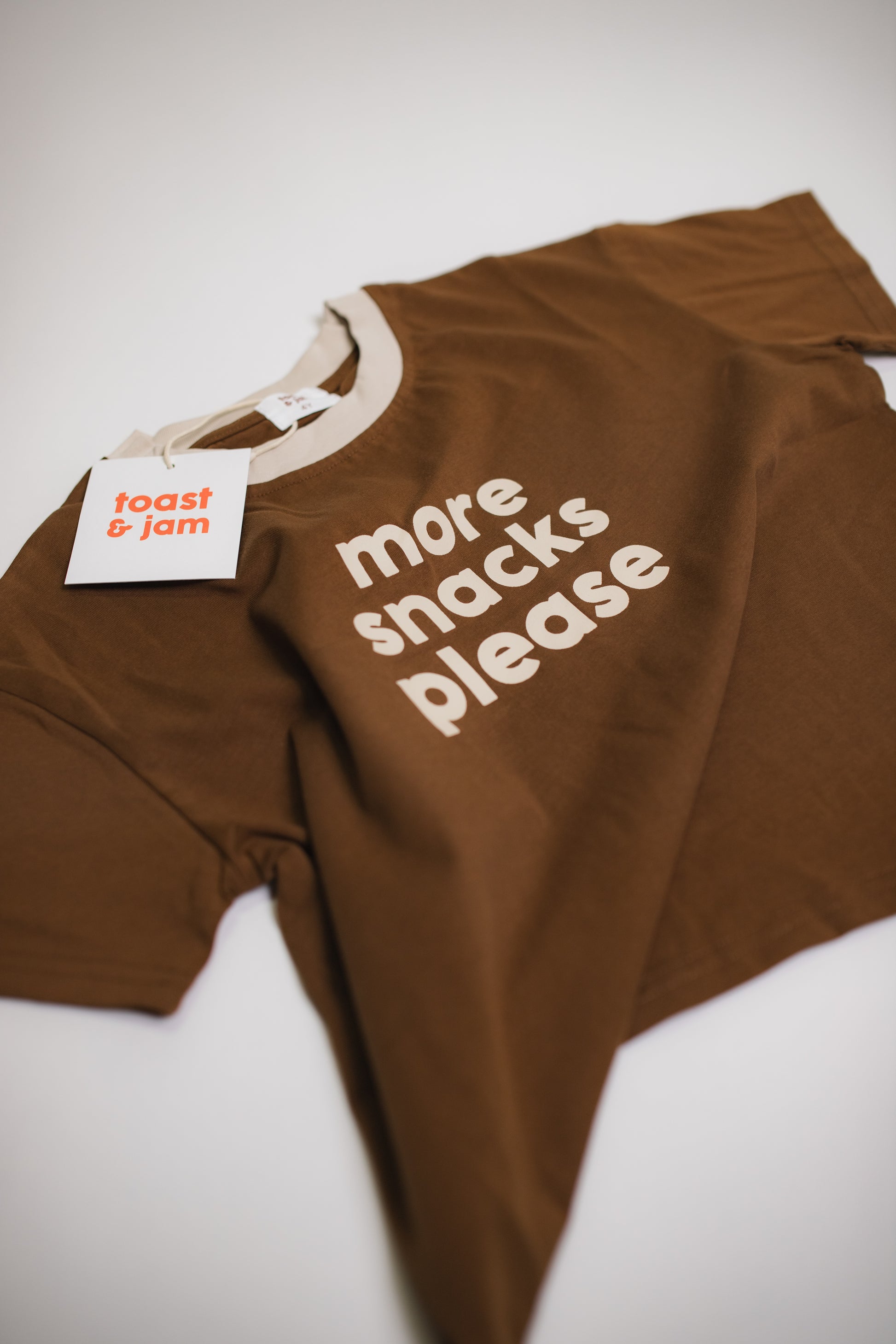 This oversized tee in a cozy toasted cocoa shade brings retro vibes with a playful twist. Made from 100% cotton, it feels soft and breathable, perfect for all-day toddler adventures. The cheeky graphic celebrates the snack-loving spirit of little ones, while the contrast ribbed neckline adds a fun, stylish touch.