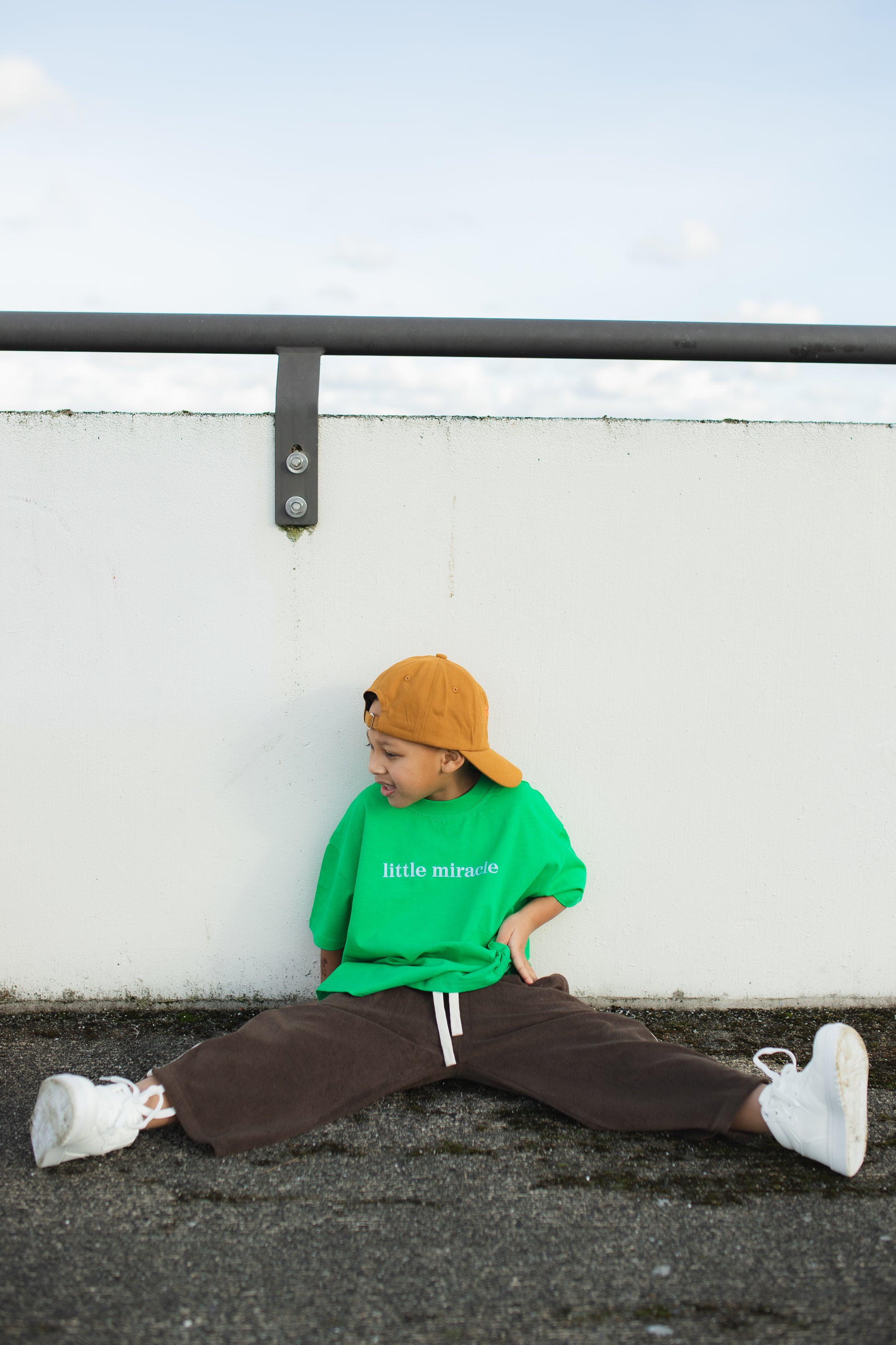 Celebrate everyday magic with the Little Miracle Tee! Crafted from 100% soft cotton, its retro-inspired boxy fit keeps comfort cool and casual. The cheerful kelly green shade paired with powder blue printing brings a fresh, playful vibe, while the sweet graphic serves as a joyful reminder of the little wonders in life. Perfect for brightening up any day!